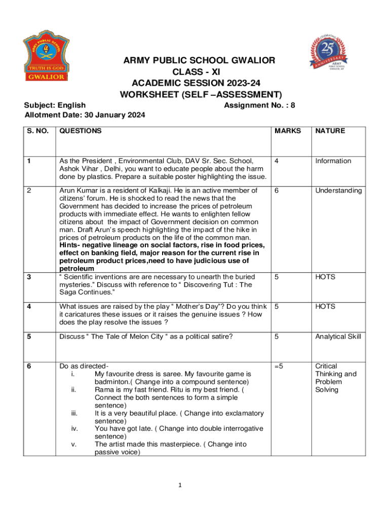 ARMY PUBLIC SCHOOL GWALIOR CLASS XI ACADEMIC SESSION 202324 WORKSHEET (SELF ASSESSMENT) Subject: English Allotment Date: 30 January 2024Assignment No. : 8S. NO.QUESTIONSMARKSNATURE1As the President