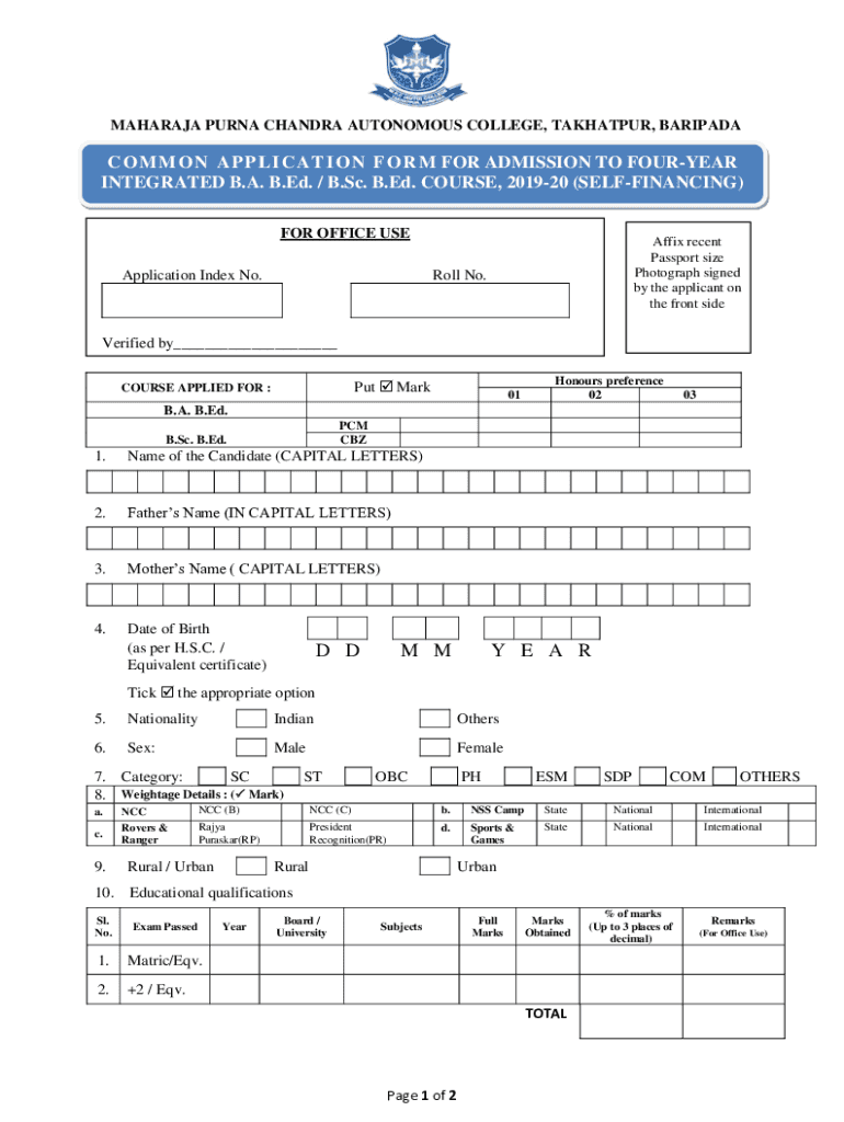 MAHARAJA PURNA CHANDRA AUTONOMOUS COLLEGE, TAKHATPUR, BARIPADAC O M M O N A P P L I C A T I O N F O R M FOR ADMISSION TO FOURYEAR INTEGRATED B.A. B.Ed. / B.Sc. B.Ed. COURSE, 201920 (SELFFINANCING)