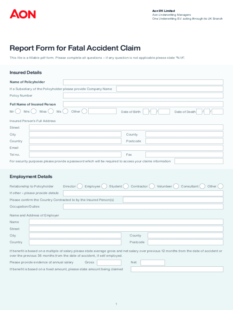 One Underwriting B.V. acting through its UK BranchReport Form for Fatal Accident Claim
