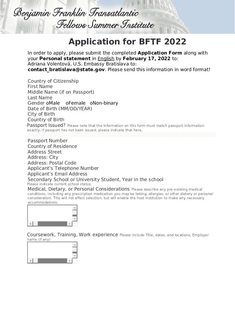 What is Do you want to take part in the prestigious BFTF exchange ... - sk usembassy Form?