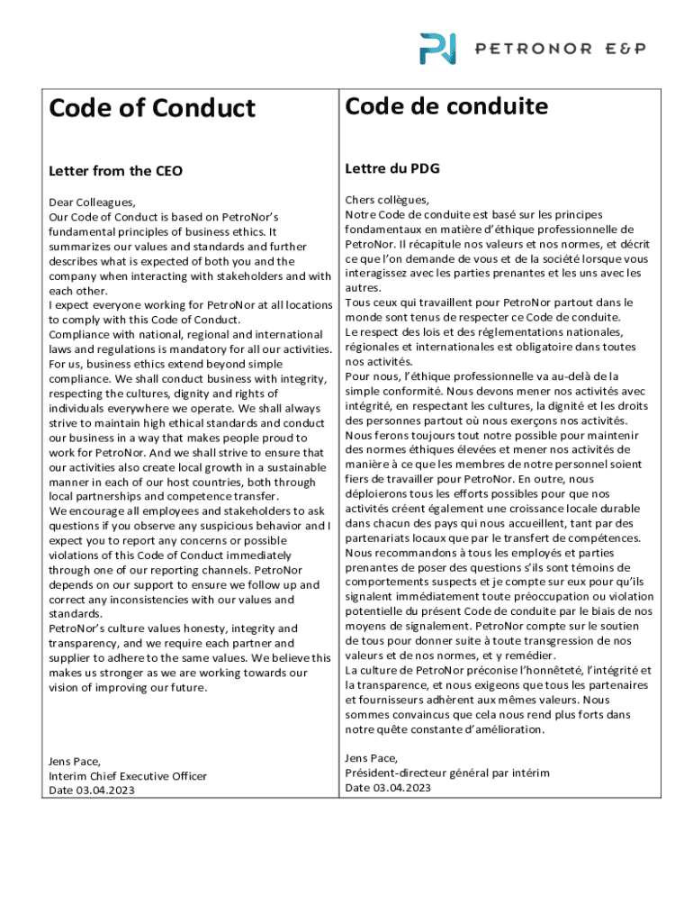 Code of ConductCode de conduiteLetter from the CEOLettre du PDGDear Colleagues, Our Code of Conduct is based on PetroNors fundamental principles of business ethics. It summarizes our values and standards
