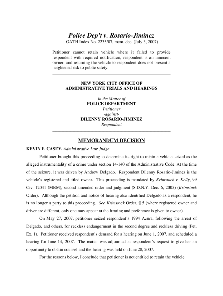Police Dept v. RosarioJiminez OATH Index No. 2235/07, mem. dec. (July 3, 2007) Petitioner cannot retain vehicle where it failed to provide respondent with required notification, respondent is an innocent
