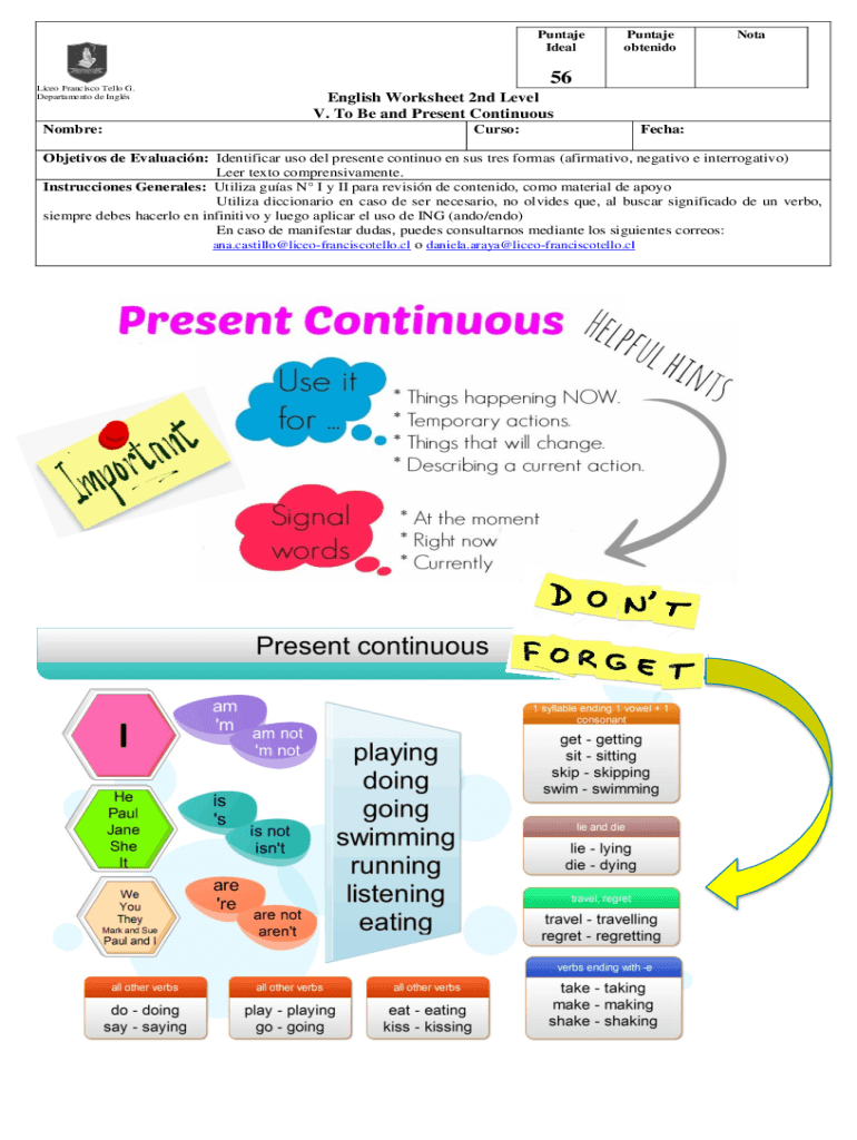 Puntaje IdealLiceo Francisco Tello G. Departamento de InglsNombre:Puntaje obtenidoNota56 English Worksheet 2nd Level V. To Be and Present Continuous Curso:Fecha:Objetivos de Evaluacin: Identificar