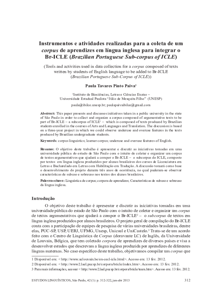 Instrumentos e atividades realizadas para a coleta de um corpus de aprendizes em lngua inglesa para integrar o BrICLE (Brazilian Portuguese Subcorpus of ICLE) (Tools and activities used in data collection