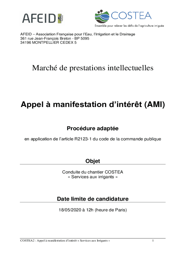 AFEID Association Franaise pour lEau, lIrrigation et le Drainage 361 rue JeanFranois Breton BP 5095 34196 MONTPELLIER CEDEX 5March de prestations intellectuellesAppel manifestation dintrt (AMI) Procdure