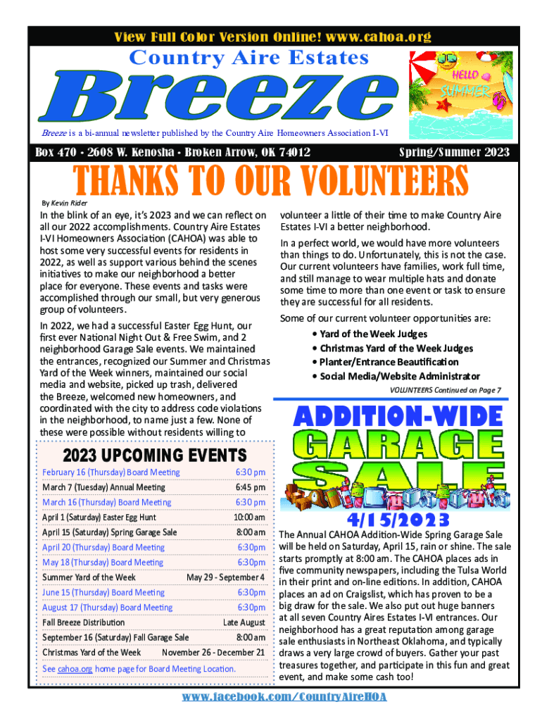 Breeze is a biannual newsletter published by the Country Are Homeowners Association Icebox 470 2608 W. Kenosha Broken Arrow,