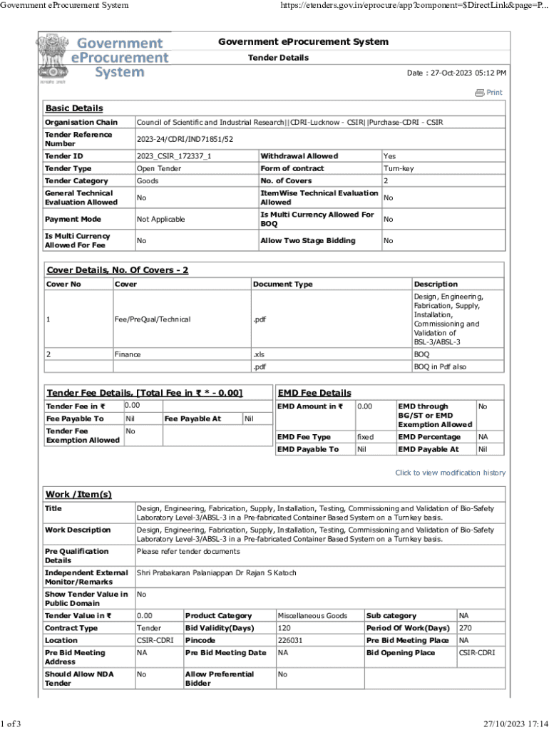 Government eProcurement System1 of 3https://etenders.gov.in/eprocure/app?component$DirectLink&pageP...Government eProcurement System Tender Details Date : 27Oct2023 05:12 PM PrintBasic Details Organisation