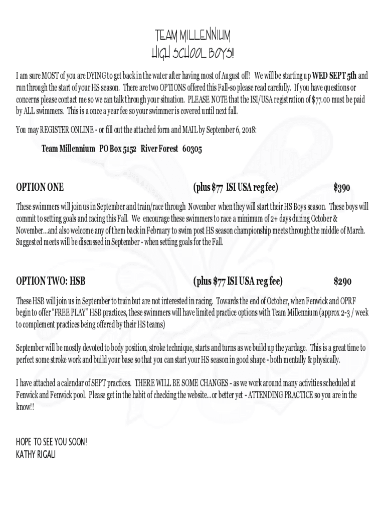 TEAM MILLENNIUM HIGH SCHOOL BOYS!! I am sure MOST of you are DYING to get back in the water after having most of August off! We will be starting up WED SEPT 5th and run through the start of your HS