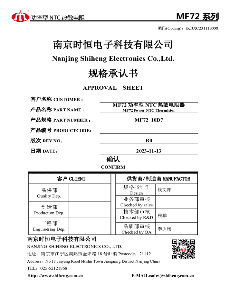 MF72 NTC (Coding)JK/JXC231113008 Nanjing Shiheng Electronics Co.,Ltd. APPROVAL CUSTOMER PART NAME SHEETMF72 NTC MF72 Power NTC ThermistorMF72 10D7 PART NUMBER PRODUCTCODEB0 REV.NO20231113 DATE CONFIRM