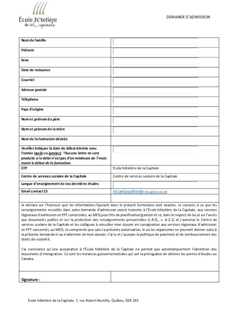 DEMANDE DADMISSIONNom de famille Prnom Sexe Date de naissance Courriel Adresse postale Tlphone Pays dorigine Nom et prnom du pre Nom et prnom de la mre Nom de la formation dsire Veuillez indiquer