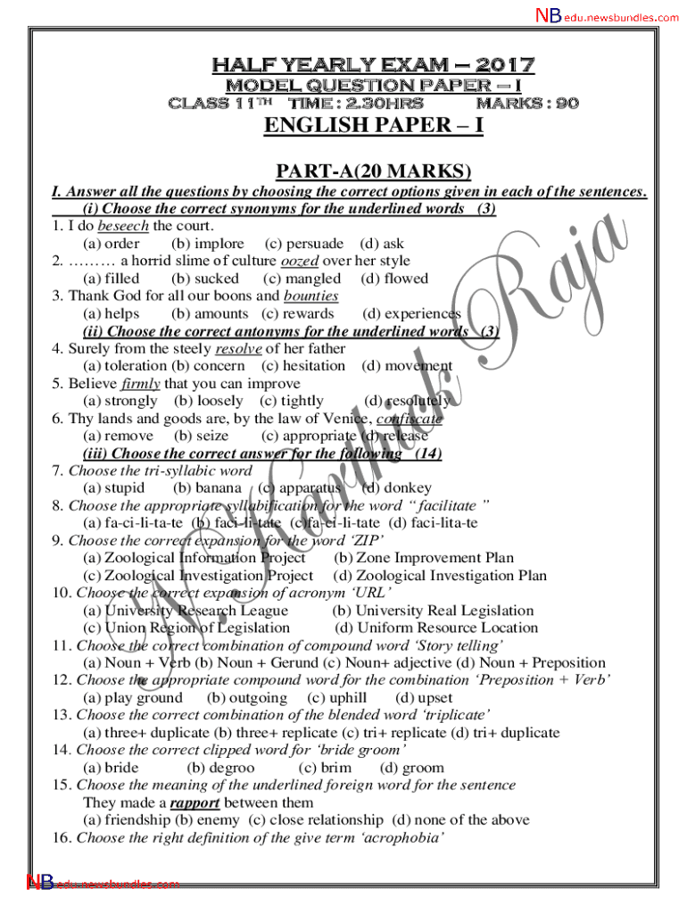 HALF YEARLY EXAM 2017 MODEL QUESTION PAPER I CLASS 11TH TIME : 2.30HRSMARKS : 90ENGLISH PAPER I PARTA(20 MARKS) I. Answer all the questions by choosing the correct options given in each of the sentences.