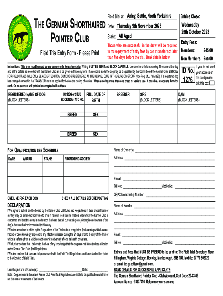 Anley, Settle, North Yorkshire Field Trial at: ___Thursday 9th November 2023 The German Shorthaired Date: ___ All Aged Stake: ___ Pointer ClubField Trial Entry Form Please PrintThose who are successful