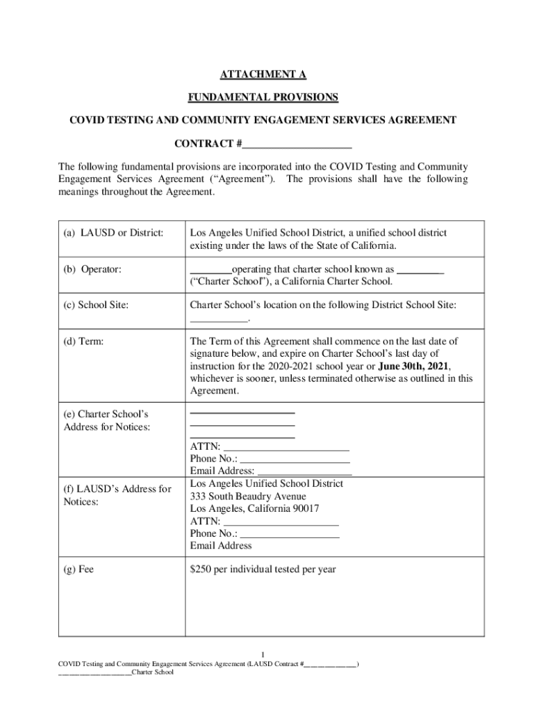 ATTACHMENT A FUNDAMENTAL PROVISIONS COVID TESTING AND COMMUNITY ENGAGEMENT SERVICES AGREEMENT CONTRACT #___ The following fundamental provisions are incorporated into the COVID Testing and Community