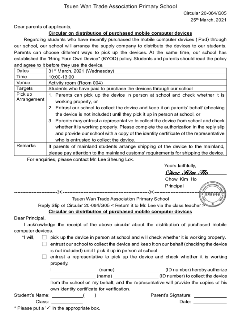 Tsuen Wan Trade Association Primary School Circular 20084/G05 25th March, 2021 Dear parents of applicants, Circular on distribution of purchased mobile computer devices Regarding students who have