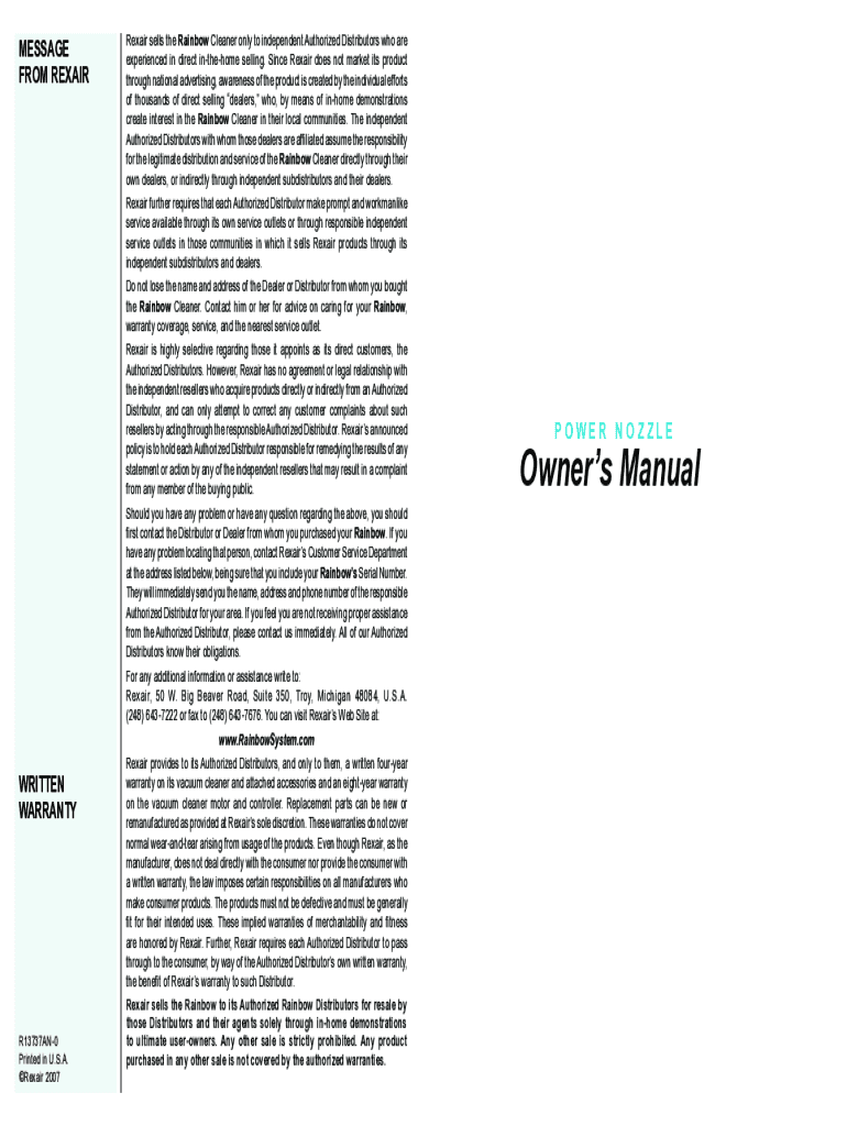 MESSAGE FROM REXAIRWRITTEN WARRANTYR13737AN0 Printed in U.S.A. Rexair 2007Rexair sells the Rainbow Cleaner only to independent Authorized Distributors who are experienced in direct inthehome selling.