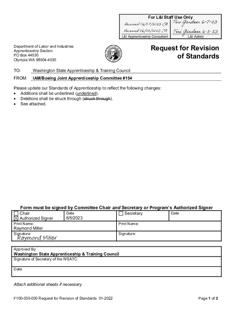 For L&I Staff Use Only ___ L&I Apprenticeship Consultant___ L&I AdminRequest for Revision of StandardsDepartment of Labor and Industries Apprenticeship Section PO Box 44530 Olympia WA 985044530TO:Washington