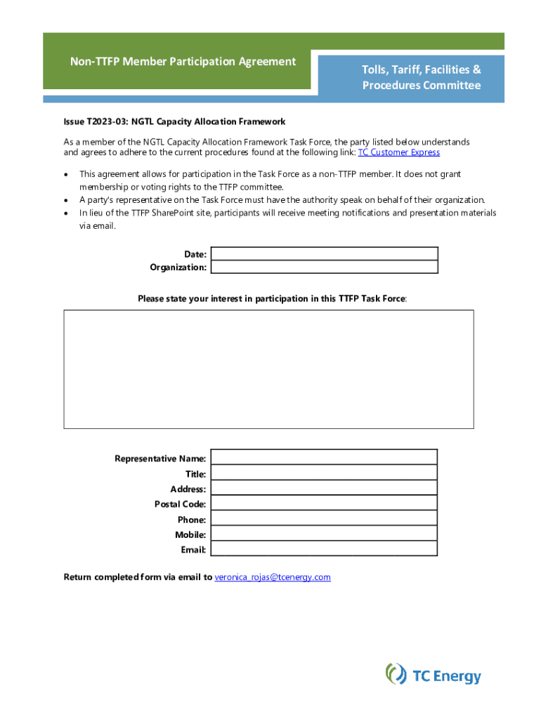 NonTTFP Member Participation AgreementTolls, Tariff, Facilities & Procedures CommitteeIssue T202303: NGTL Capacity Allocation Framework As a member of the NGTL Capacity Allocation Framework Task Force,