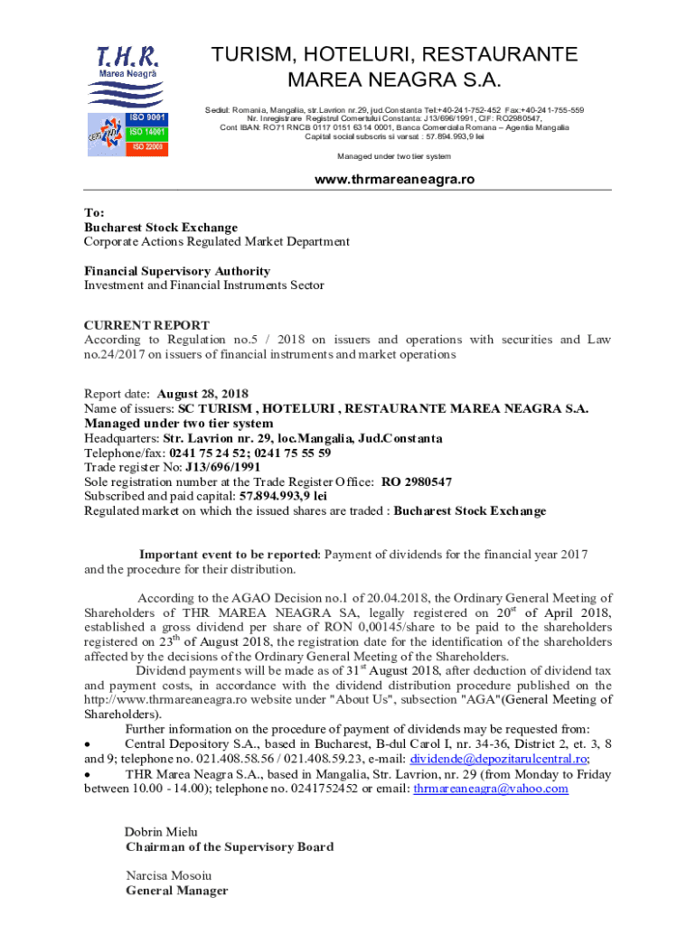 TURISM, HOTELURI, RESTAURANTE MAREA NEAGRA S.A. Sediul: Romania, Mangalia, str.Lavrion nr.29, jud.Constanta Tel:+40241752452 Fax:+40241755559 Nr. Inregistrare Registrul Comertului Constanta: J13/696/1991,