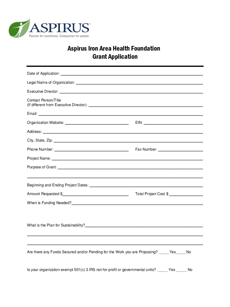 Aspirus Iron Area Health Foundation Grant Application Date of Application: Legal Name of Organization: Executive Director: Contact Person/Title (If different from Executive Director): Email: Organization