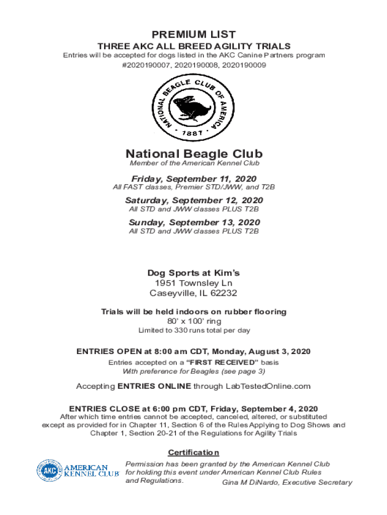 PREMIUM LISTTHREE AKC ALL BREED AGILITY TRIALSEntries will be accepted for dogs listed in the AKC Canine Partners program #2020190007, 2020190008, 2020190009National Beagle Club Member of the American