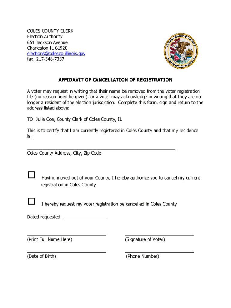 COLES COUNTY CLERK Election Authority 651 Jackson Avenue Charleston IL 61920 elections@colesco.illinois.gov fax: 2173487337AFFIDAVIT OF CANCELLATION OF REGISTRATION A voter may request in writing