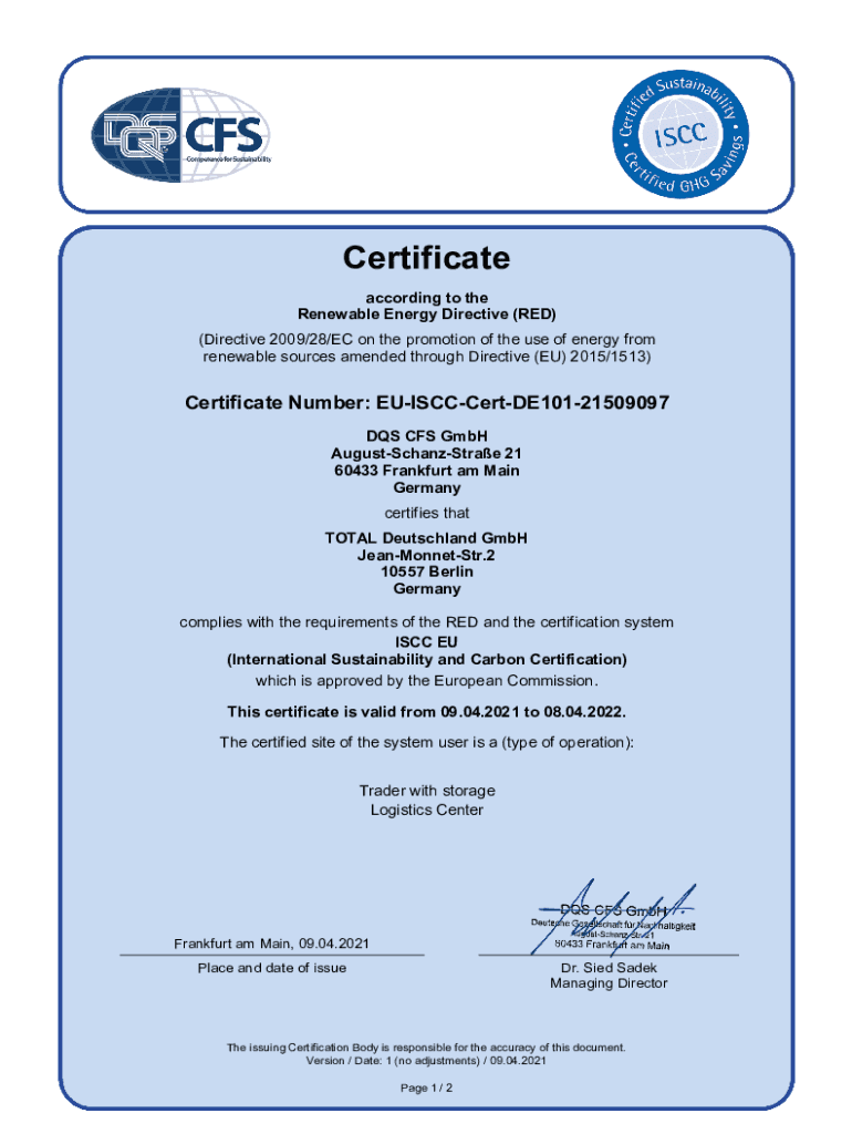 Certificate according to the Renewable Energy Directive (RED) (Directive 2009/28/EC on the promotion of the use of energy from renewable sources amended through Directive (EU) 2015/1513)Certificate