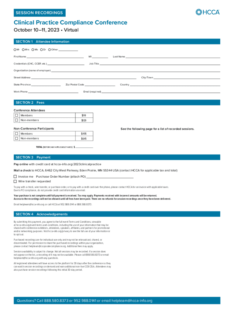 SESSION RECORDINGSClinical Practice Compliance Conference October 1011, 2023 Virtual SECTION 1Attendee Information MrMrsMsDrOtherFirst NameMICredentials (CHC, CCEP, etc.)Job Title Last Name Organization