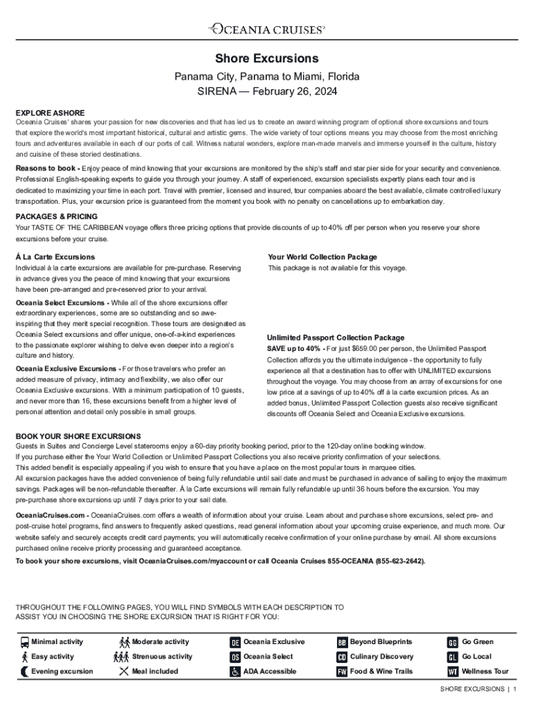 Shore Excursions Panama City, Panama to Miami, Florida SIRENA February 26, 2024 EXPLORE ASHORE Oceania Cruises\' shares your passion for new discoveries and that has led us to create an award winning