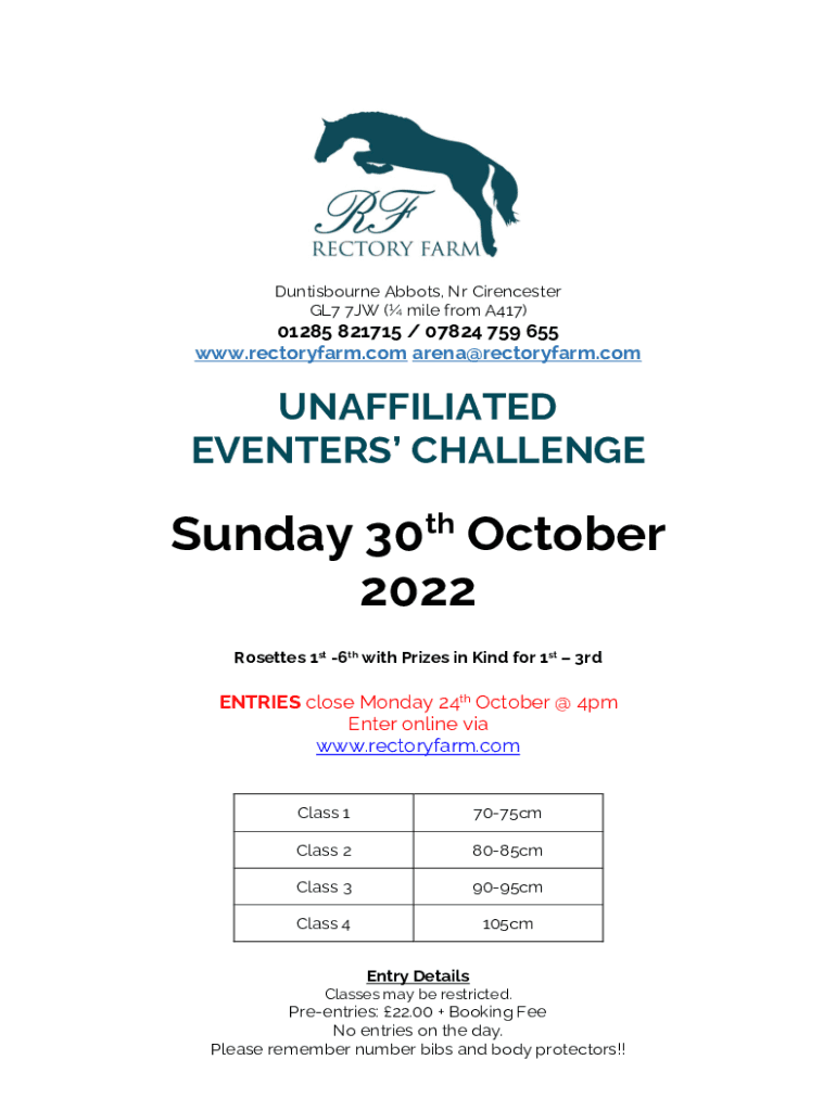 Duntisbourne Abbots, Nr Cirencester GL7 7JW ( mile from A417)01285 821715 / 07824 759 655 www.rectoryfarm.com arena@rectoryfarm.comUNAFFILIATED EVENTERS CHALLENGESunday 30th October 2022 Rosettes