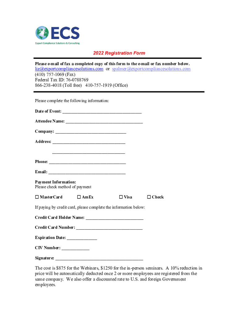 2022 Registration Form Please email of fax a completed copy of this form to the email or fax number below.liz@exportcompliancesolutions.com or spalmer@exportcompliancesolutions.com (410) 7571069 (Fax)