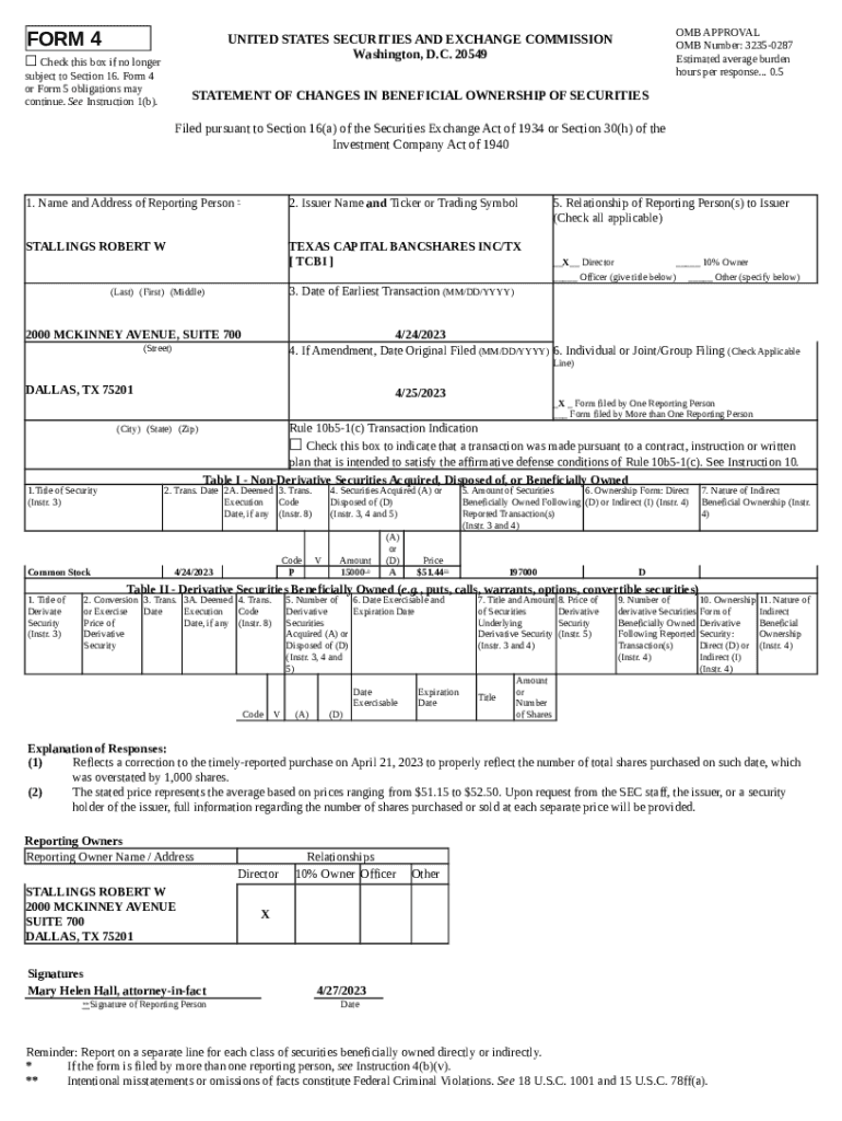 Instructions for the form TEXAS CAPITAL BANCSHARES INC/TX (: 4/A, Received
