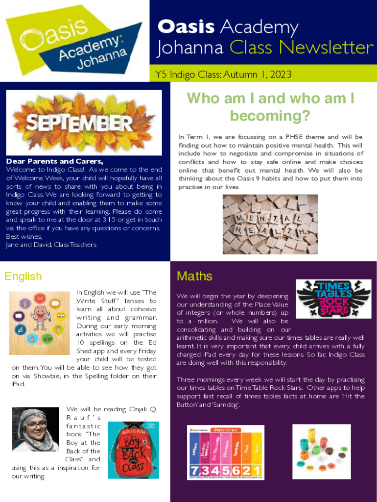 Oasis Academy Johanna Class Newsletter Y5 Indigo Class: Autumn 1, 2023Who am I and who am I becoming? Dear Parents and Carers, Welcome to Indigo Class! As we come to the end of Welcome Week, your