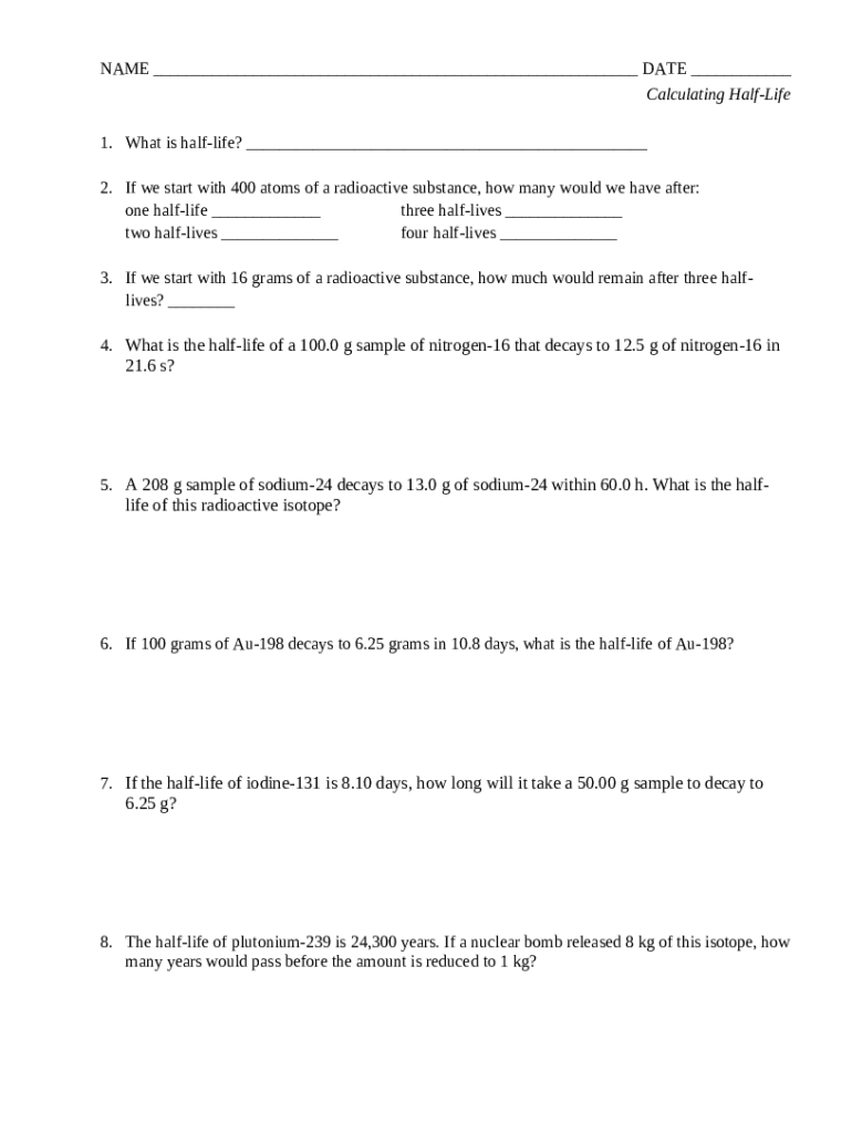 The Name: Date: Period: Half-life practice 1. What is radioactivity? is a Word document which can be filled-out and signed for specified reasons. In that case, it is furnished to the exact addressee to provide certain info of any kinds. The completion and signing is able in hard copy by hand or via an appropriate solution like PDFfiller. Such tools help to send in any PDF or Word file without printing out. It also allows you to edit its appearance for the needs you have and put legit electronic signature. Upon finishing, you send the Name: Date: Period: Half-life practice 1. What is radioactivity? to the recipient or several of them by email or fax. PDFfiller has a feature and options that make your Word form printable. It has various options when printing out appearance. It doesn't matter how you'll file a document - in hard copy or by email - it will always look professional and clear. To not to create a new document from the beginning every time, make the original file into a template. Later, you will have a rewritable sample.