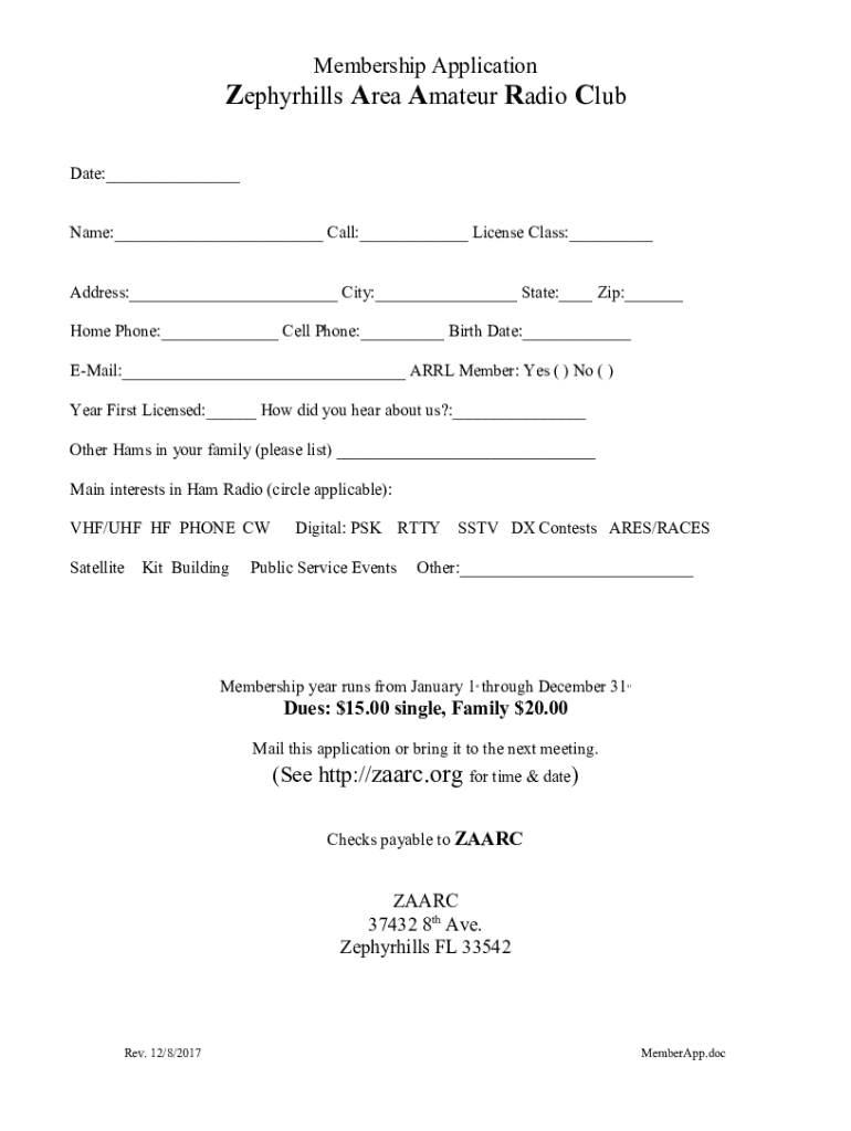 Membership ApplicationZephyrhills Area Amateur Radio Club Date:___ Name:___ Call:___ License Class:___ Address:___ City:___ State:___ Zip:___ Home Phone:___ Cell Phone:___ Birth Date:___ EMail:___