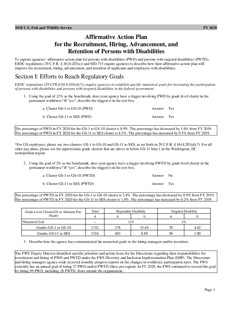 DOI U.S. Fish and Wildlife ServiceFY 2020Affirmative Action Plan for the Recruitment, Hiring, Advancement, and Retention of Persons with Disabilities To capture agencies affirmative action plan for