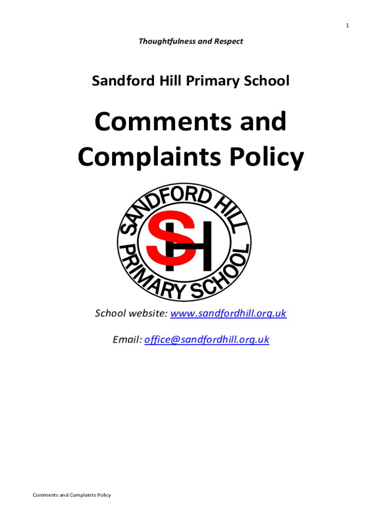 1Thoughtfulness and RespectSandford Hill Primary SchoolComments and Complaints PolicySchool website: www.sandfordhill.org.uk Email: office@sandfordhill.org.ukComments and Complaints Policy2This complaints
