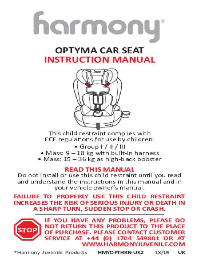 OPTYMA CAR SEAT INSTRUCTION MANUALThis child restraint complies with ECE regulations for use by children: Group I / II / III Mass: 9 18 kg with builtin harness Mass: 15 36 kg as highback boosterREAD