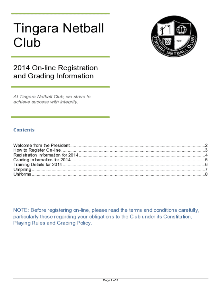 Tingara Netball Club 2014 Online Registration and Grading Information At Tingara Netball Club, we strive to achieve success with integrity. Contents Welcome from the President .............................................................................................................2
