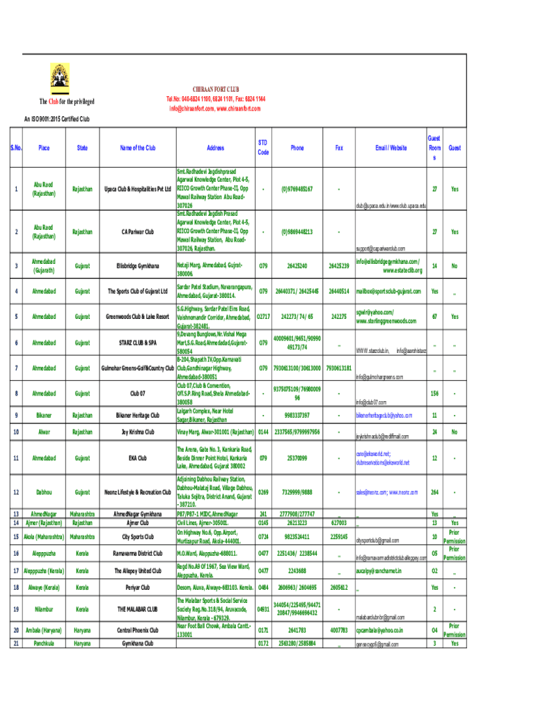CHIRAAN FORT CLUB Tel.No: 0406824 1100, 6824 1101, Fax: 6824 1144 info@chiraanfort.com, www.chiraanfort.comThe Club for the privileged An ISO 9001:2015 Certified ClubS.No.Place1Abu Raod (Rajasthan)2Abu