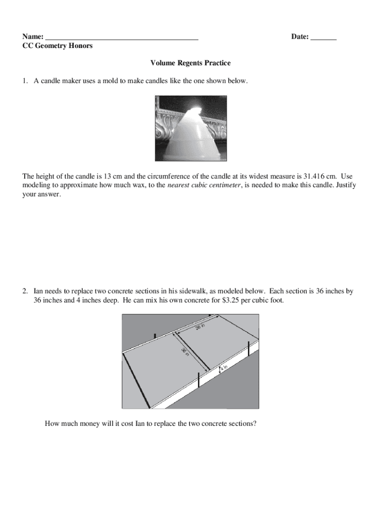 Name: ___ CC Geometry HonorsDate: ___Volume Regents Practice 1. A candle maker uses a mold to make candles like the one shown below.The height of the candle is 13 cm and the circumference of the candle