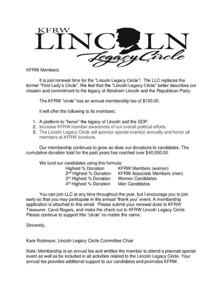 former First Lady's Circle. We feel that the Lincoln Legacy Circle better describes our