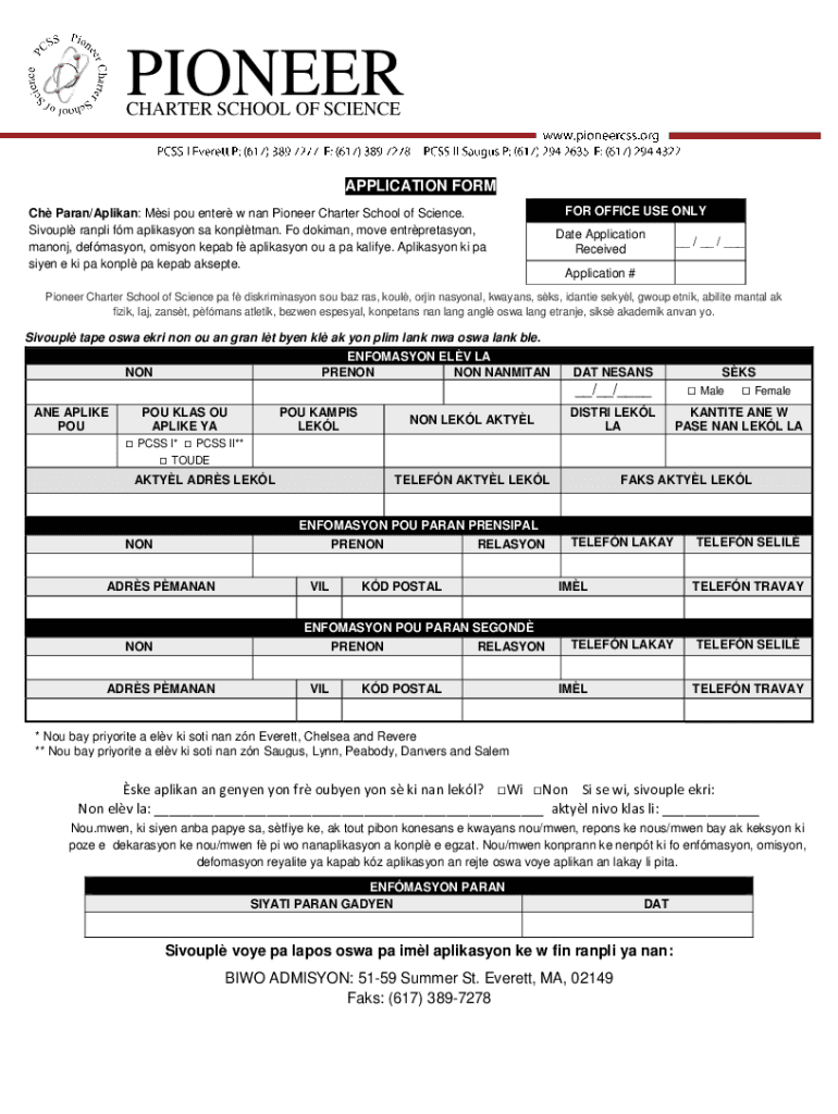 Ch Paran/Aplikan: Msi pou enter w nan Pioneer Charter School of Science.