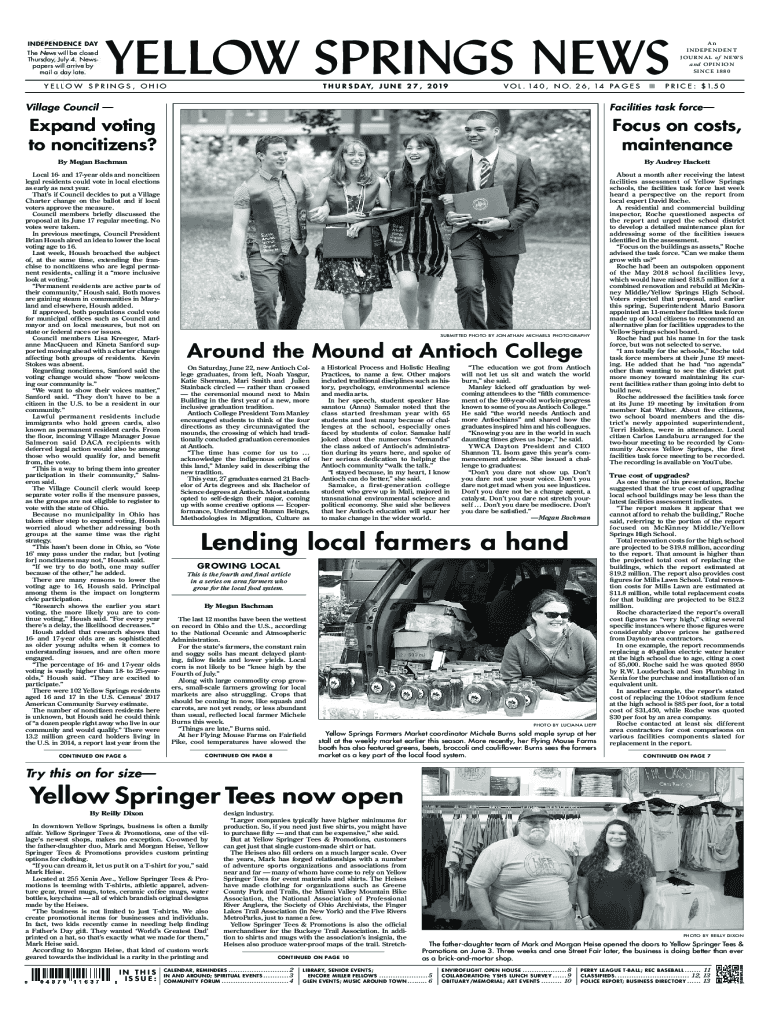 INDEPENDENCE DAYAn INDEPENDEN T JOURNAL of NEWS and O P I N I O N S I NC E 18 8 0The News will be closed Thursday, July 4. Newspapers will arrive by mail a day late.YELLOW SPRINGS, OHIOT H U R S D