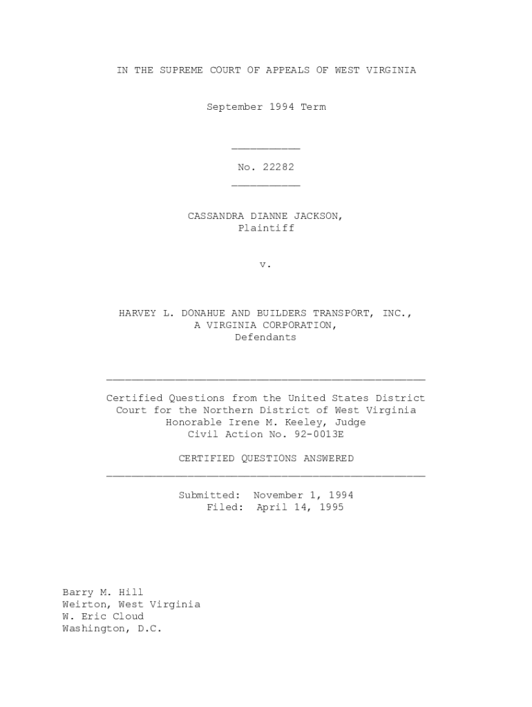 IN THE SUPREME COURT OF APPEALS OF WEST VIRGINIA September 1994 Term ___ No. 22282 ___ CASSANDRA DIANNE JACKSON, Plaintiff v.HARVEY L. DONAHUE AND BUILDERS TRANSPORT, INC., A VIRGINIA CORPORATION,