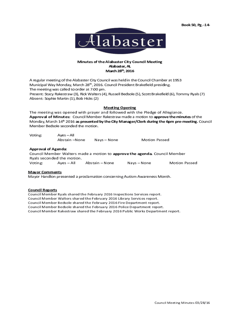 Book 50, Pg. 14Minutes of the Alabaster City Council Meeting Alabaster, AL March 28th, 2016 A regular meeting of the Alabaster City Council was held in the Council Chamber at 1953 Municipal Way Monday,