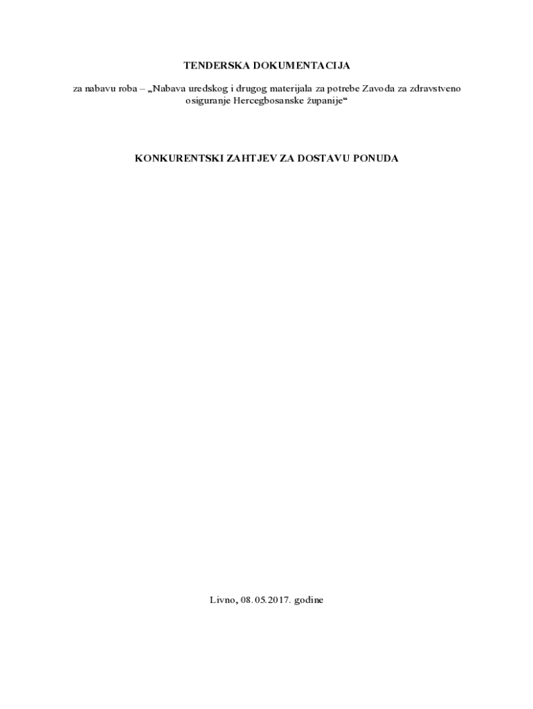 TENDERSKA DOKUMENTACIJA za nabavu roba Nabava uredskog i drugog materijala za potrebe Zavoda za zdravstveno osiguranje Hercegbosanske upanijeKONKURENTSKI ZAHTJEV ZA DOSTAVU PONUDALivno, 08.05.2017.