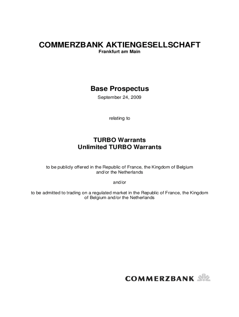 COMMERZBANK AKTIENGESELLSCHAFT Frankfurt am MainBase Prospectus September 24, 2009relating toTURBO Warrants Unlimited TURBO Warrantsto be publicly offered in the Republic of France, the Kingdom of