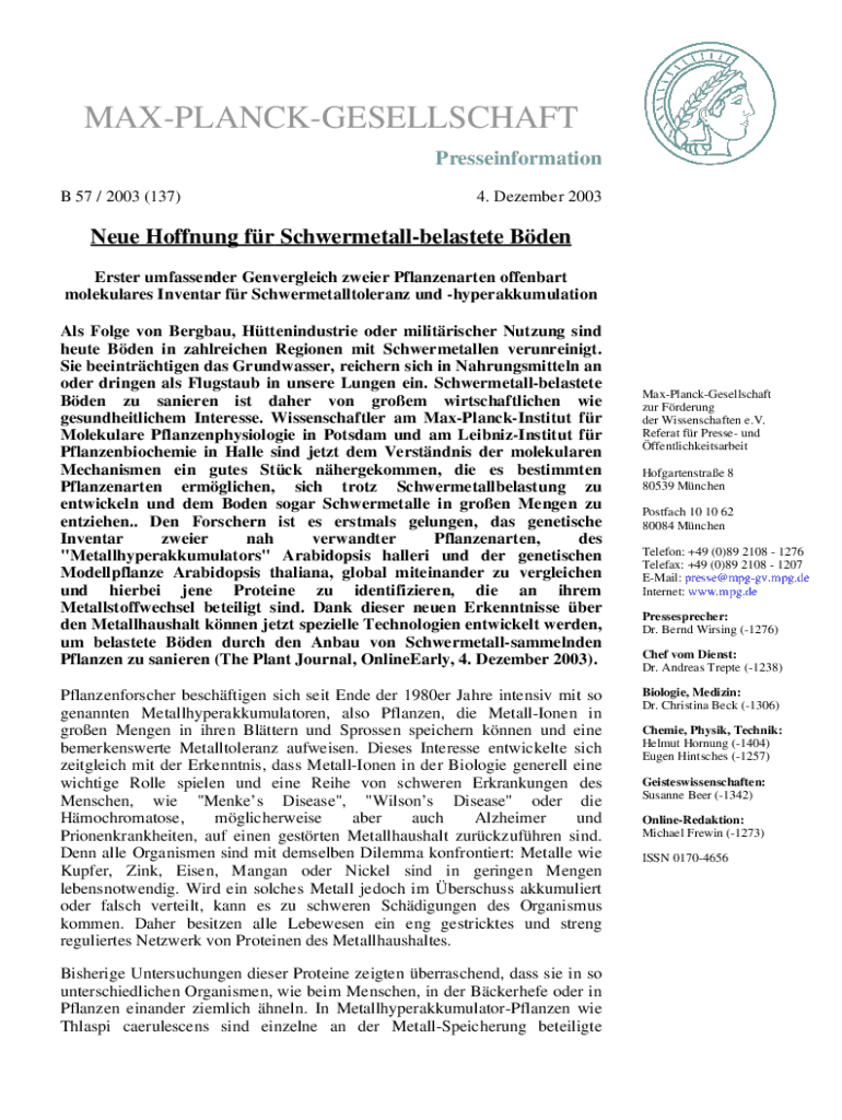 MAXPLANCKGESELLSCHAFT Presseinformation B 57 / 2003 (137)4. Dezember 2003Neue Hoffnung fr Schwermetallbelastete Bden Erster umfassender Genvergleich zweier Pflanzenarten offenbart molekulares Inventar