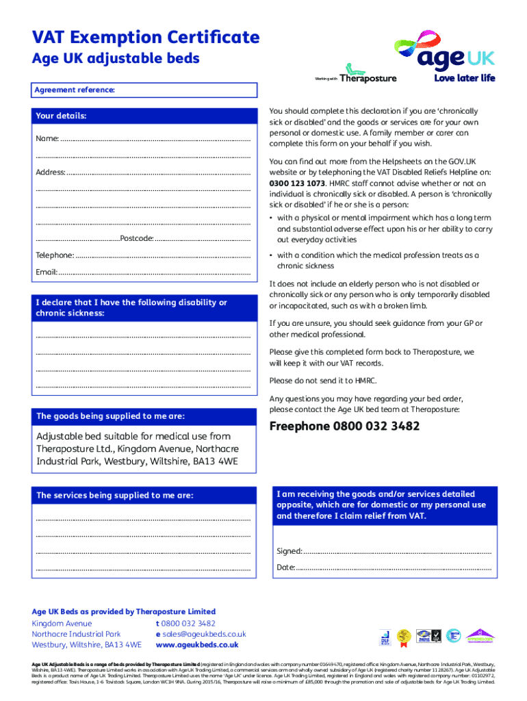 VAT Exemption Certificate Age UK adjustable bedsWorking withAgreement reference:Your details: Name:....................................................................................................