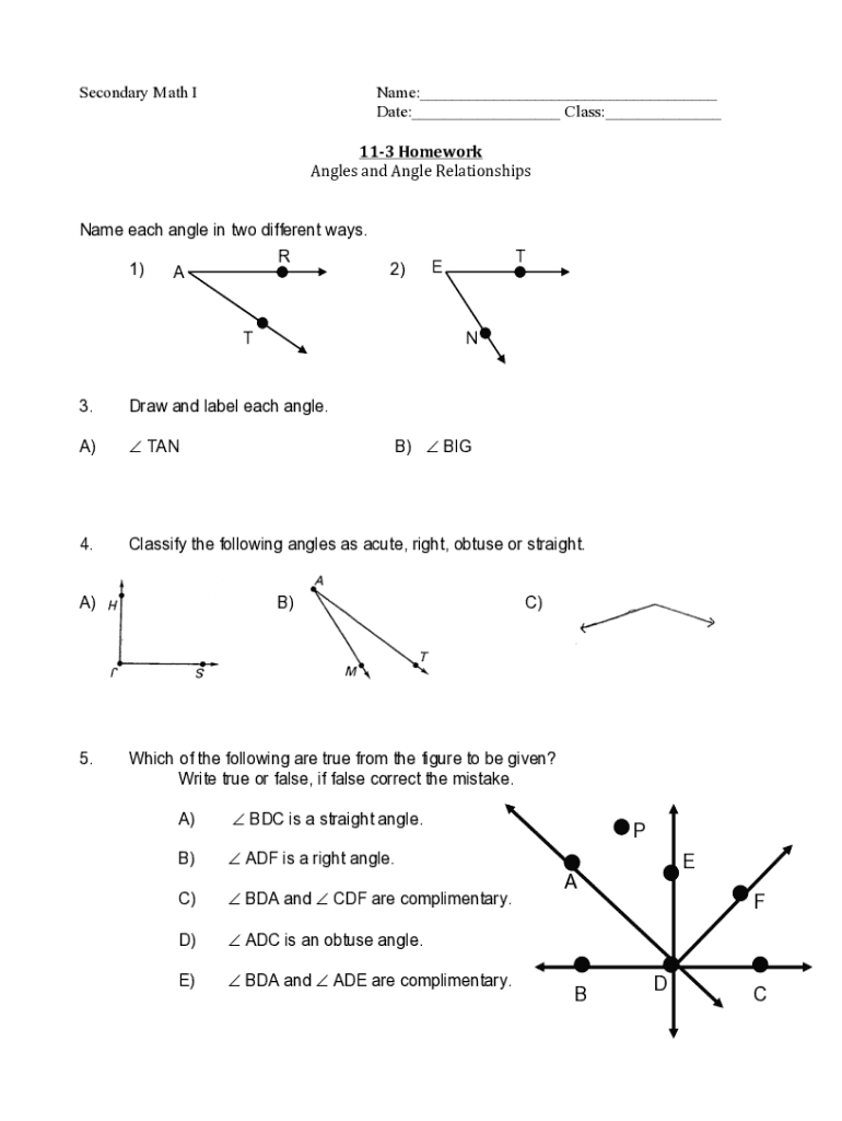 Secondary Math IName:___ Date:___ Class:___ 113Homework AnglesandAngleRelationships Name each angle in two different ways. 1)RA2)TTEN3.Draw and label each angle.A) TAN4.Classify the following angles